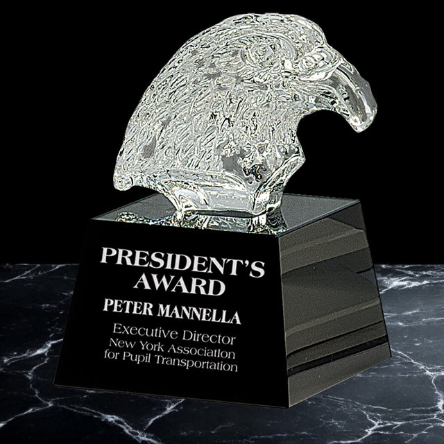 The eagle head is expertly crafted to catch and reflect light, creating a breathtaking display of beauty and power. The head sits atop a sleek black pedestal base, providing a sharp contrast and a touch of sophistication to the award.