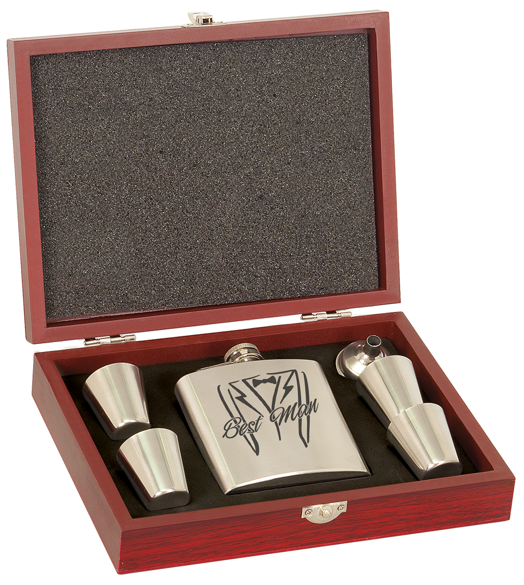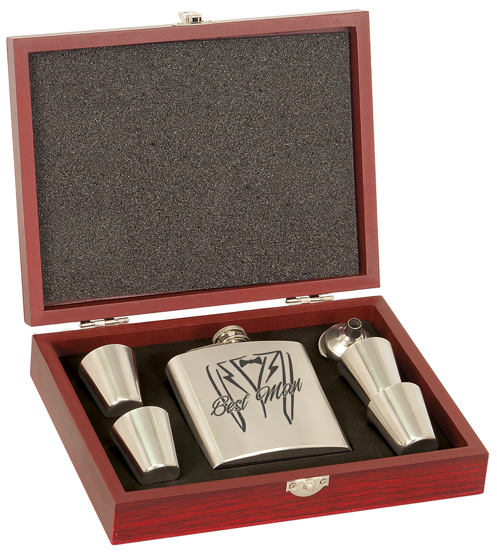 Enjoy the perfect night out with our stylish Flask Sets with 4 Stainless Steel Shot Glasses. Their sleek design, laser engravability, and stainless steel craftsmanship make these flasks the perfect way to bring your favorite drinks on the go. The perfect accessory for any special occasion!