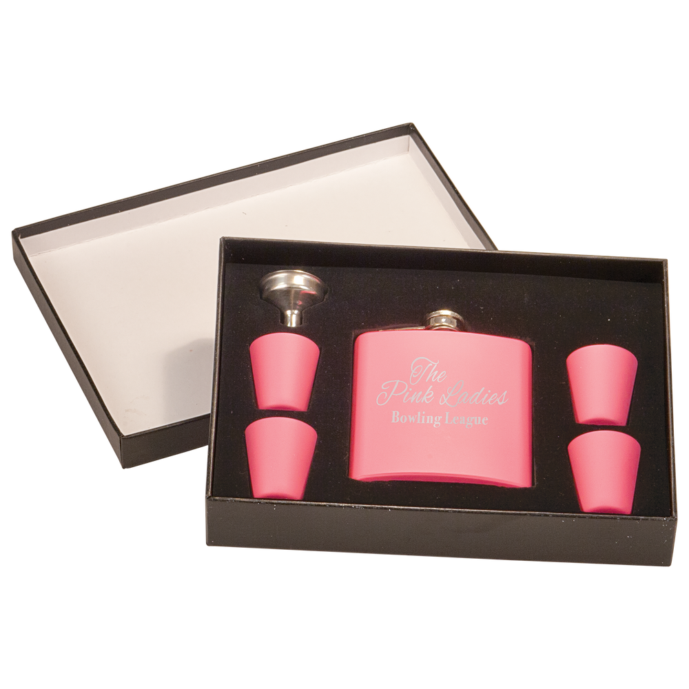 6 oz. Flask Sets w/ 4 Stainless Steel Shot Glasses - Pink Stainless Steel is backordered and will ship as soon as it is back in stock.