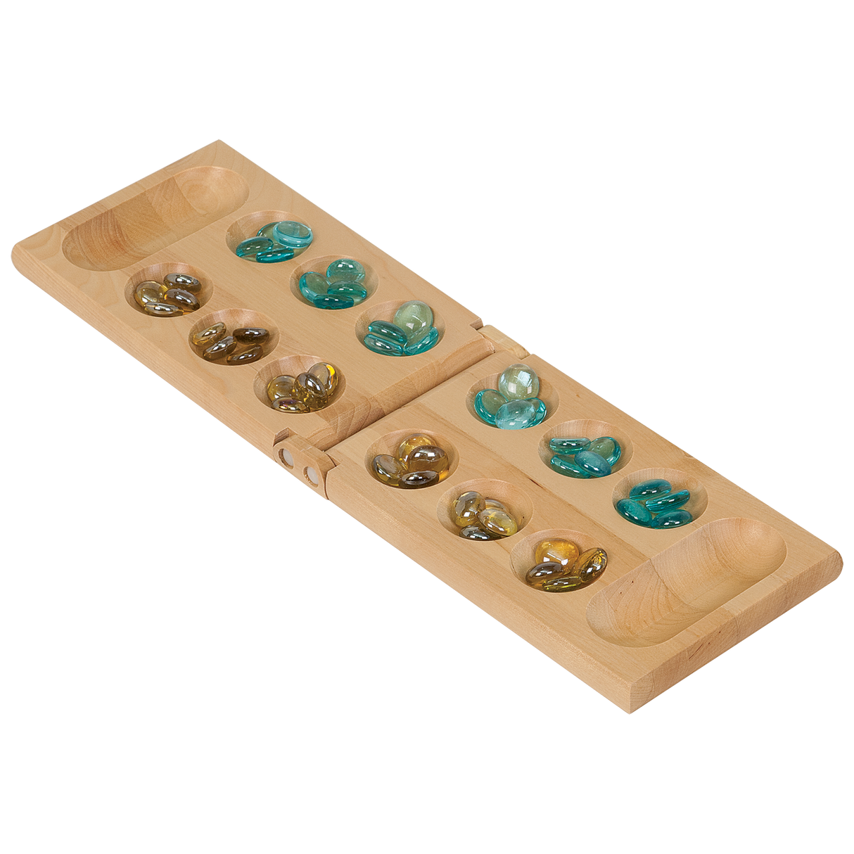 Mancala is a classic board game that has been enjoyed by players for centuries. It's a simple yet strategic game that is perfect for players of all ages. Our mancala set includes everything you need to play this timeless game. The set includes a beautiful wooden board with six pits on each side and a larger pit at each end.
